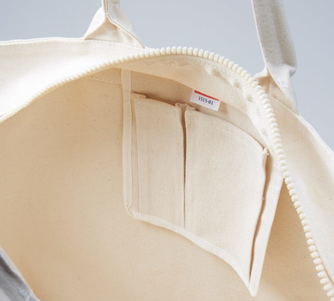 キャンバス生地のため、しっかりとした頑丈な生地が特徴のジップトートバッグです。内側に使い勝手のいいポケット付き。ファスナー付で大容量のトートバッグ