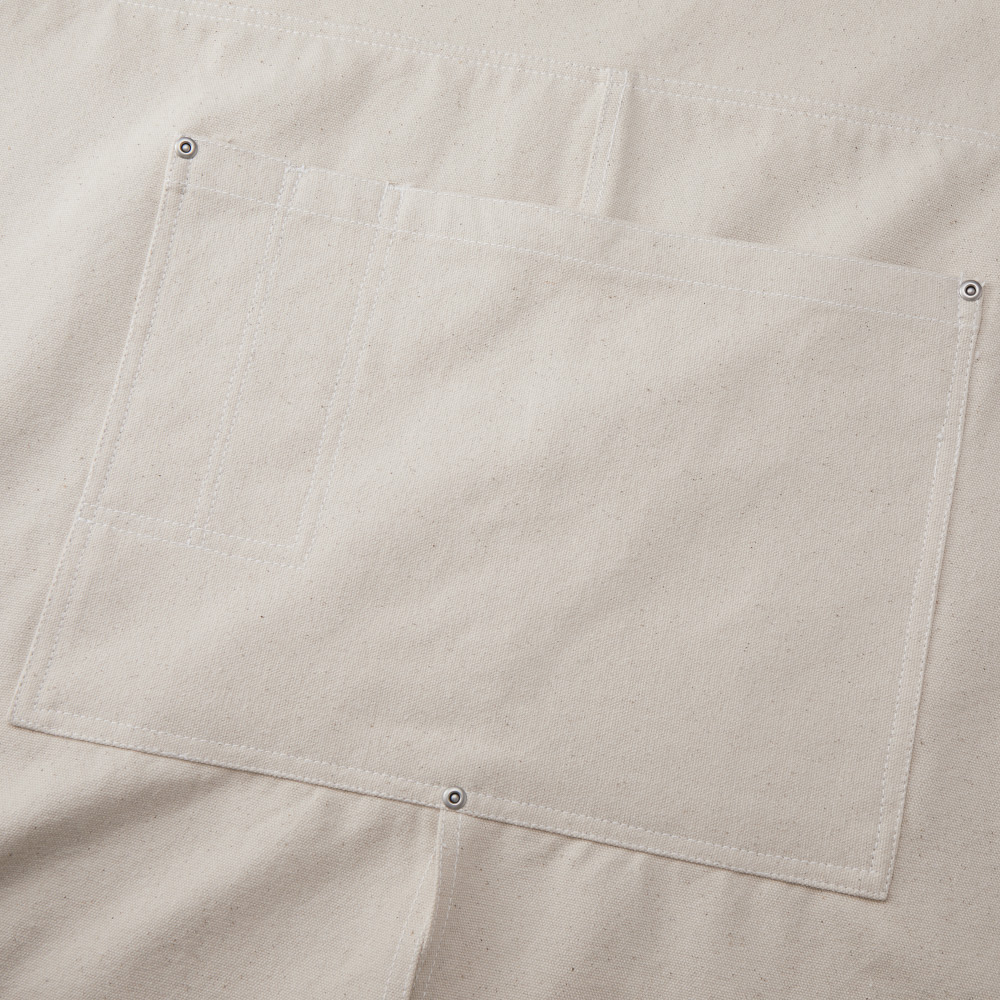 フロントスリットを配置することにより引っかかりを軽減。しゃがみやすいため、キッチンからガーデニングと幅広いワークウェアとしても利用可能。ペン差し付きの大振りのポケット付きのため実用性も抜群。また、マットシルバーのリベットやアイレットのギミックが頑丈さとオーセンティックさを表現しています。12.2oz/yd2のヘヴィーな生地と実用性をそなえたワークエプロン