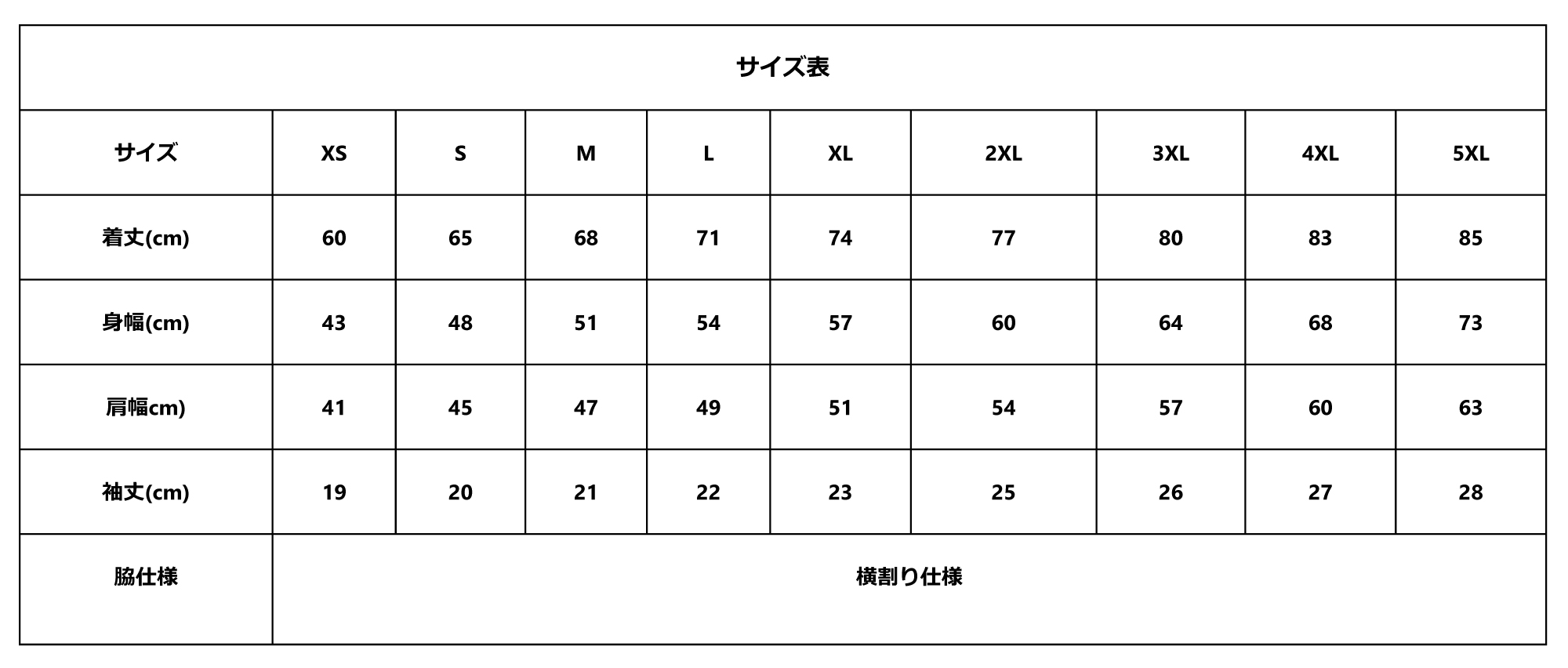 サイズ XS S M L XL 2XL 3XL 4XL 5XL